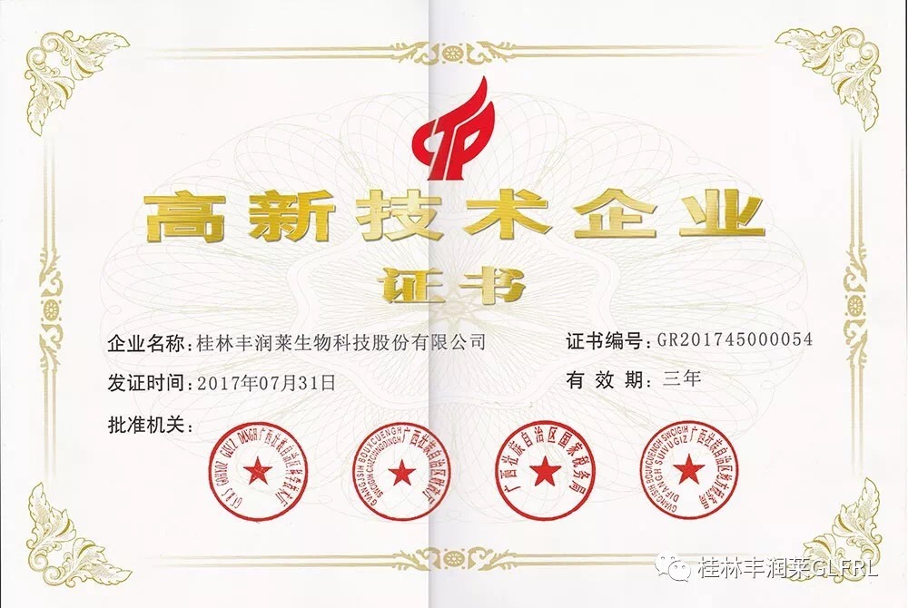 《高新技術企業認定管理工作指引》(國科發火〔2016〕195號)有關規定,桂林豐潤萊生物科技股份有限公司被認定